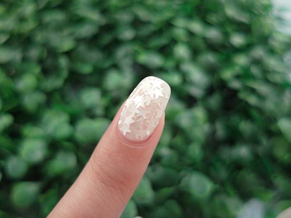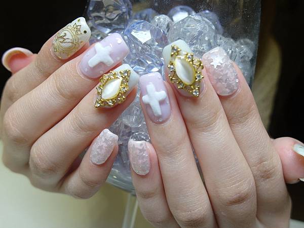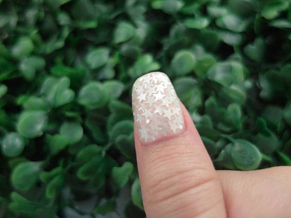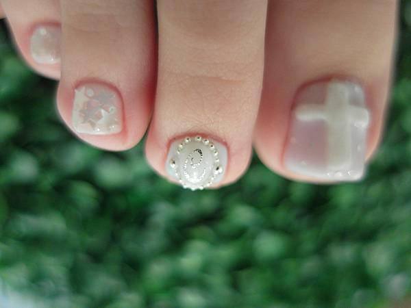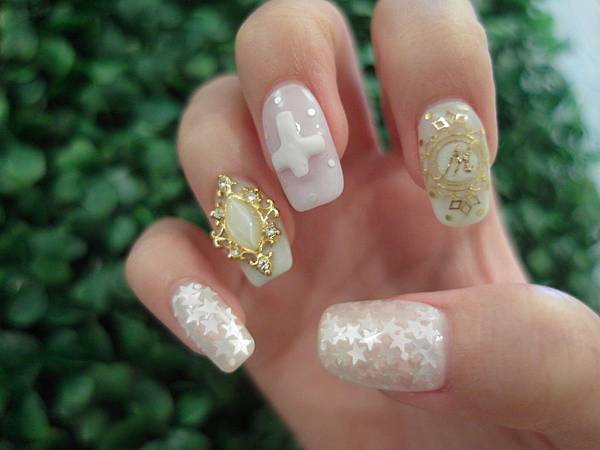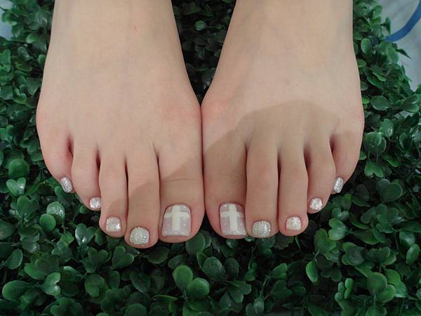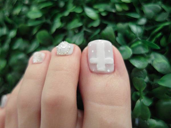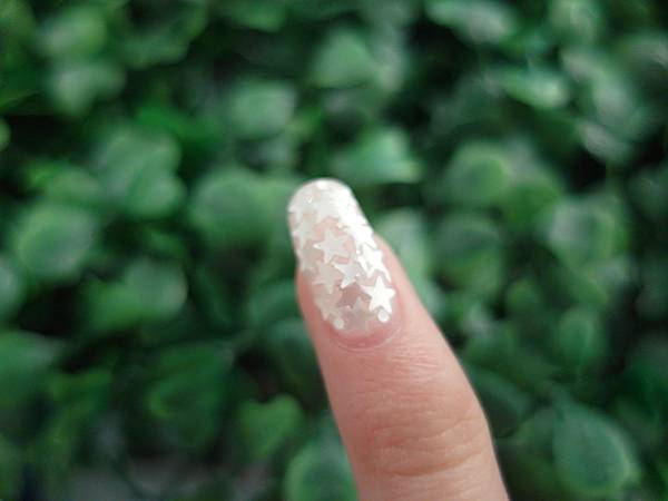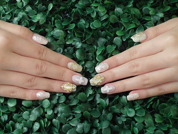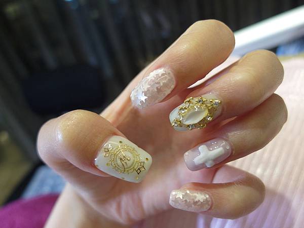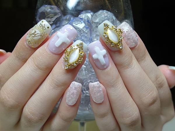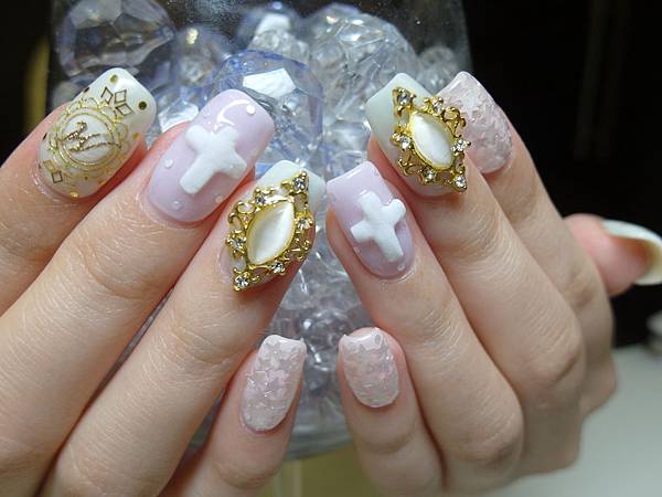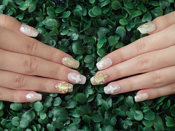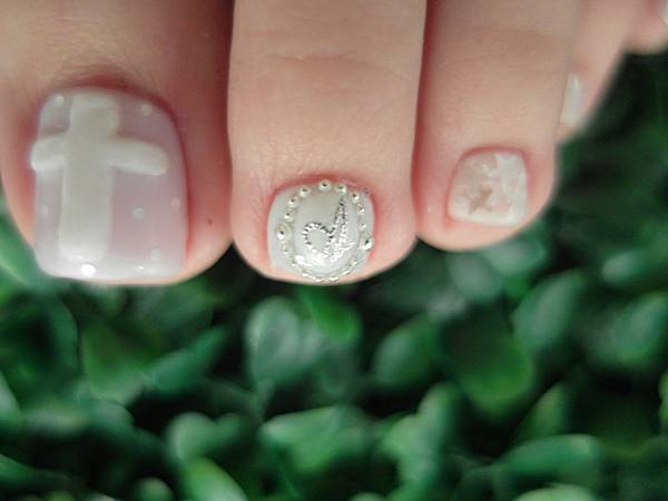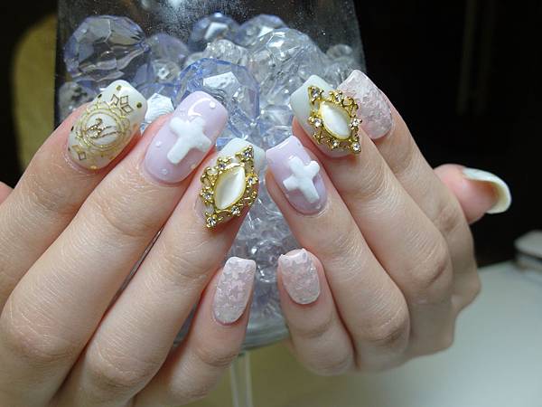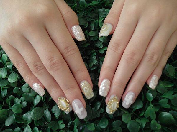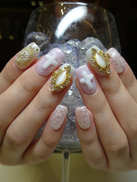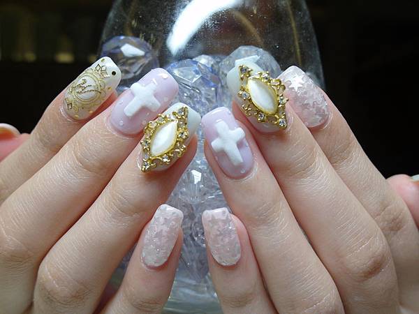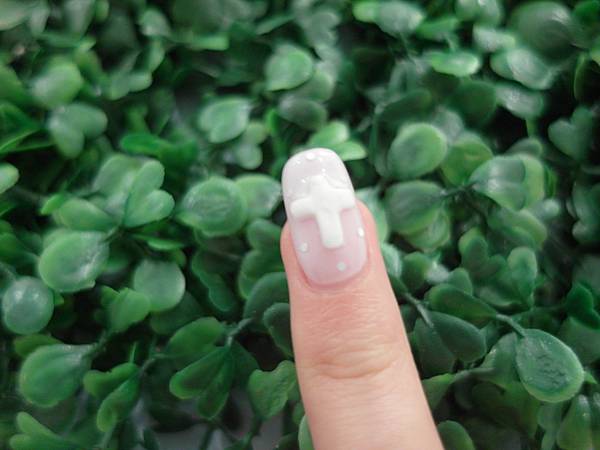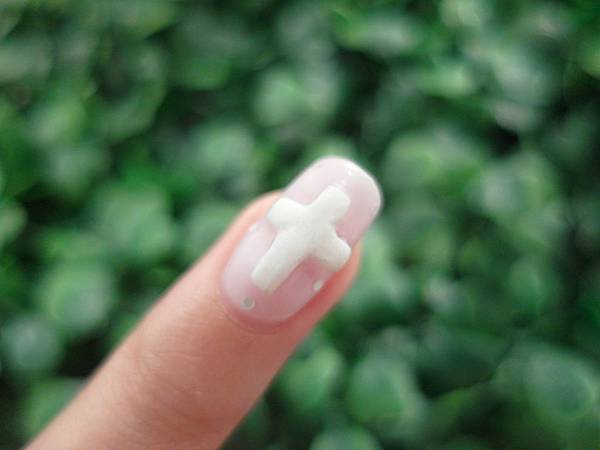 手指的十字架粉雕, 底部當然也用了乳白色圓形亮片裝飾!